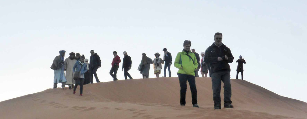 Nach 2 Nächten in Fes, fuhren wir weiter über den Mittleren Atlas, mit seinen Zedern- und Kieferwäldern, in den Süden. Vorbei an Landschaften, die sich ständig änderten, bis am Abend die roten Sanddünen und unser Wüstenhotel auftauchte. Die Stille, die Dunkelheit am Morgen, das lautlose Hineinwandern auf Kamelen, im Vertrauen auf unserer einheimischen Führer, hinauf auf die Sanddünen zum Sonnenaufgang, war eine der wunderschönen Erfahrungen dieser Reise.