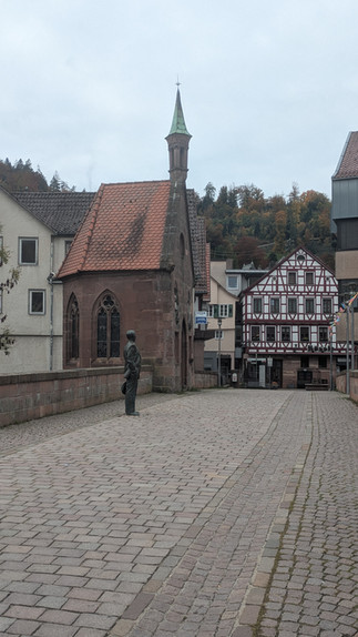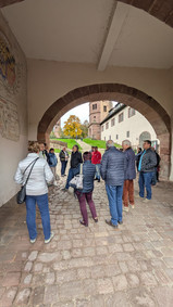 Im Anschluss daran erfolgte die Fahrt zu unserem ersten Stopp der Reise: Calw, die Hermann-Hesse-Stadt. Jürgen, unser Reiseleiter für die nächsten Tage, zeigte uns die beeindruckende historische Altstadt mit ihren Fachwerkhäusern und erzählte uns von der Entwicklung. Danach war noch etwas Zeit für einen Bummel auf eigene Faust, bevor es zum gemeinsamen Mittagessen in eine umgebaute Turnhalle ging.